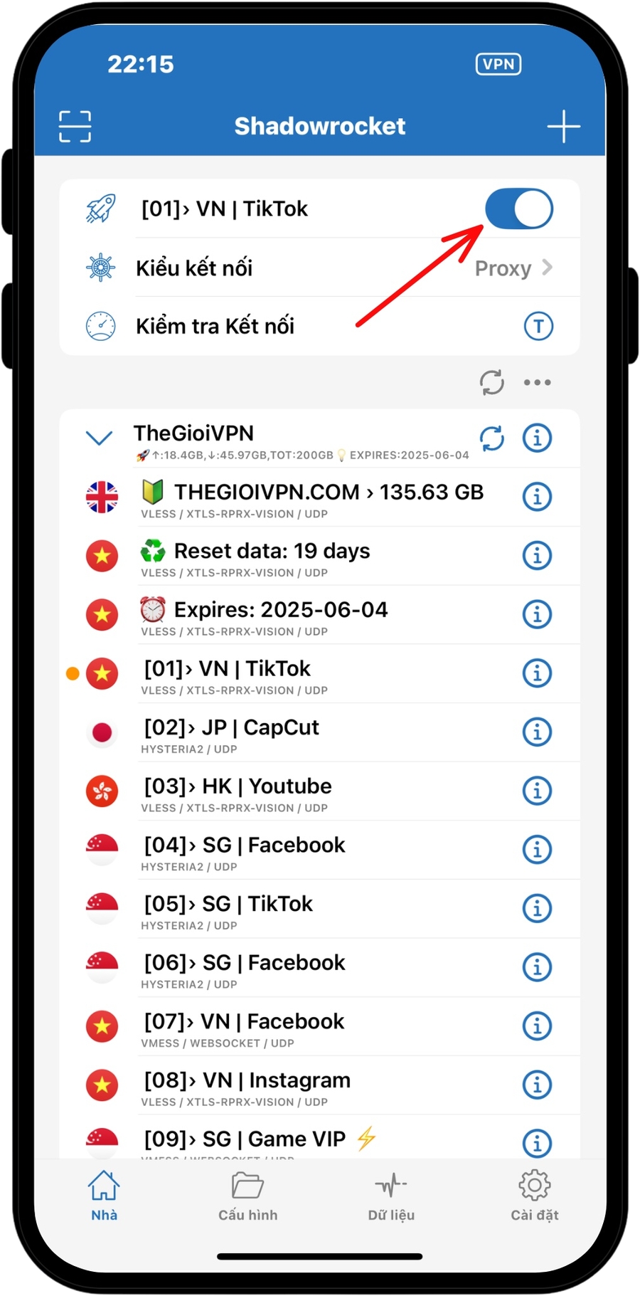 ⚠️ Bước 2: Chọn máy chủ phù hợp để sử dụng, vui lòng đổi Kiểu kết nối thành Proxy.